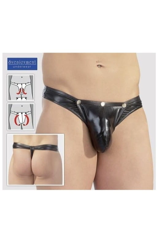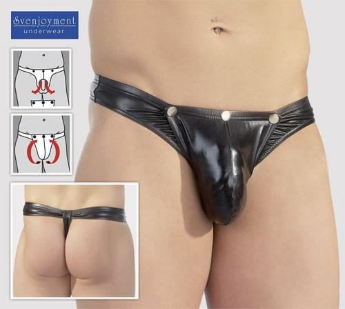 Czarne seksowne stringi posiadają specjalny otwór przez który przekłada się penisa i jądra dzięki czemu świetnie wypełniają odpinaną za pomocą trzech zatrzasków przednią część stringów.