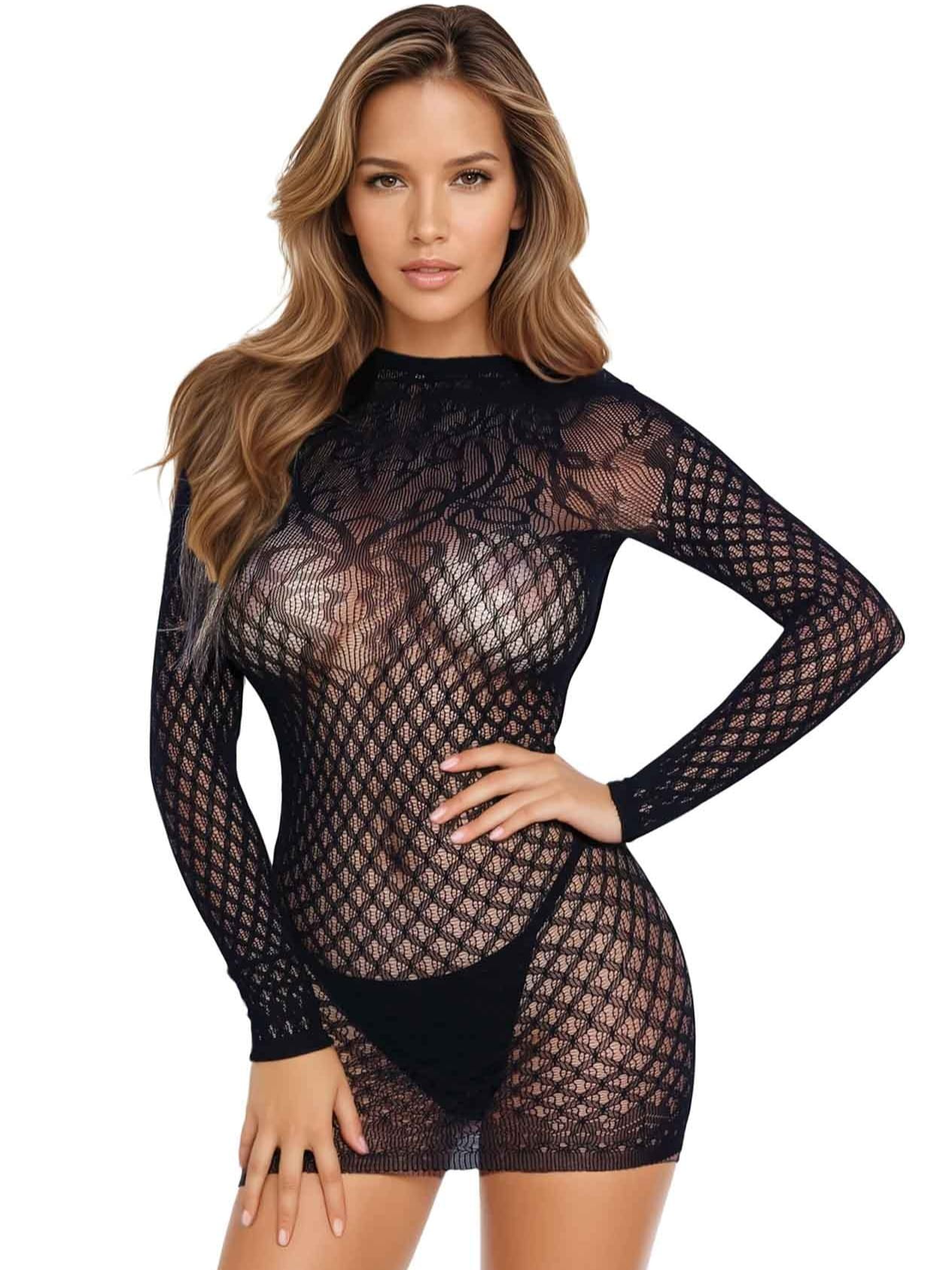 Czarna mini sukienka Midnight Net Dress to wyjątkowe połączenie elegancji i seksapilu. Zmysłowa sukienka erotyczna stworzona z delikatnej siateczki i subtelnej koronki podkreśli Twoje wdzięki. Net Dress z długim rękawem przyciąga uwagę dopasowanym krojem, który idealnie podkreśla linię biustu, talii oraz bioder. Ozdobny wzór siateczki efektownie eksponuje Twoją sylwetkę, a koronkowe detale dodają całości wyjątkowego charakteru.