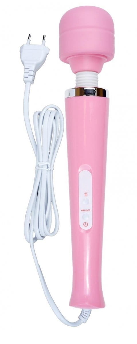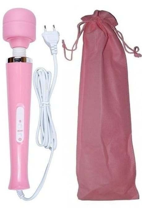 Wibrator w różowym kolorze zasilany jest długim kablem z gniazdka elektrycznego.